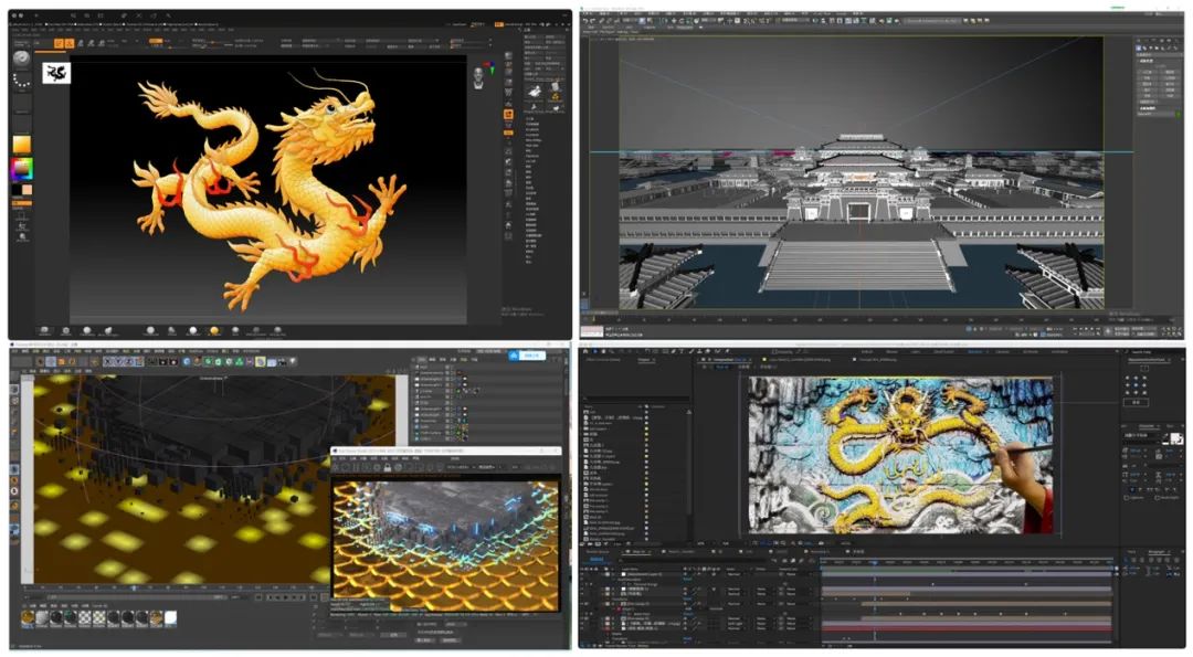 三维动画设计制作团队承担着策划执行、分镜、建模、纹理、灯光、动画、音频、剪辑等多项工作任务,在108秒的时间内,将13个大场景、近35个镜头容纳其间。龙的形态建模,是对天龙行健邮票龙形的三维化数字呈现,对龙身进行骨骼绑定,实现腾飞、旋转、上天入地的动态效果。与静态的龙不同,团队既要考虑动态龙的运动规律、运动轨迹、姿态的呈现,更要对龙的气质和精神进行整体把握,还要处理多个场景画面的复杂与多元素化等问题。通过大量的调研、尝试,团队尽可能地实现龙在腾飞过程中的流畅度与真实感,同时进行相关文献资料的收集、整理和归纳,形成对未央宫及内部陈设等内容设计制作的文化基础,最终实现了对《甲辰年》特种邮票的深度诠释。