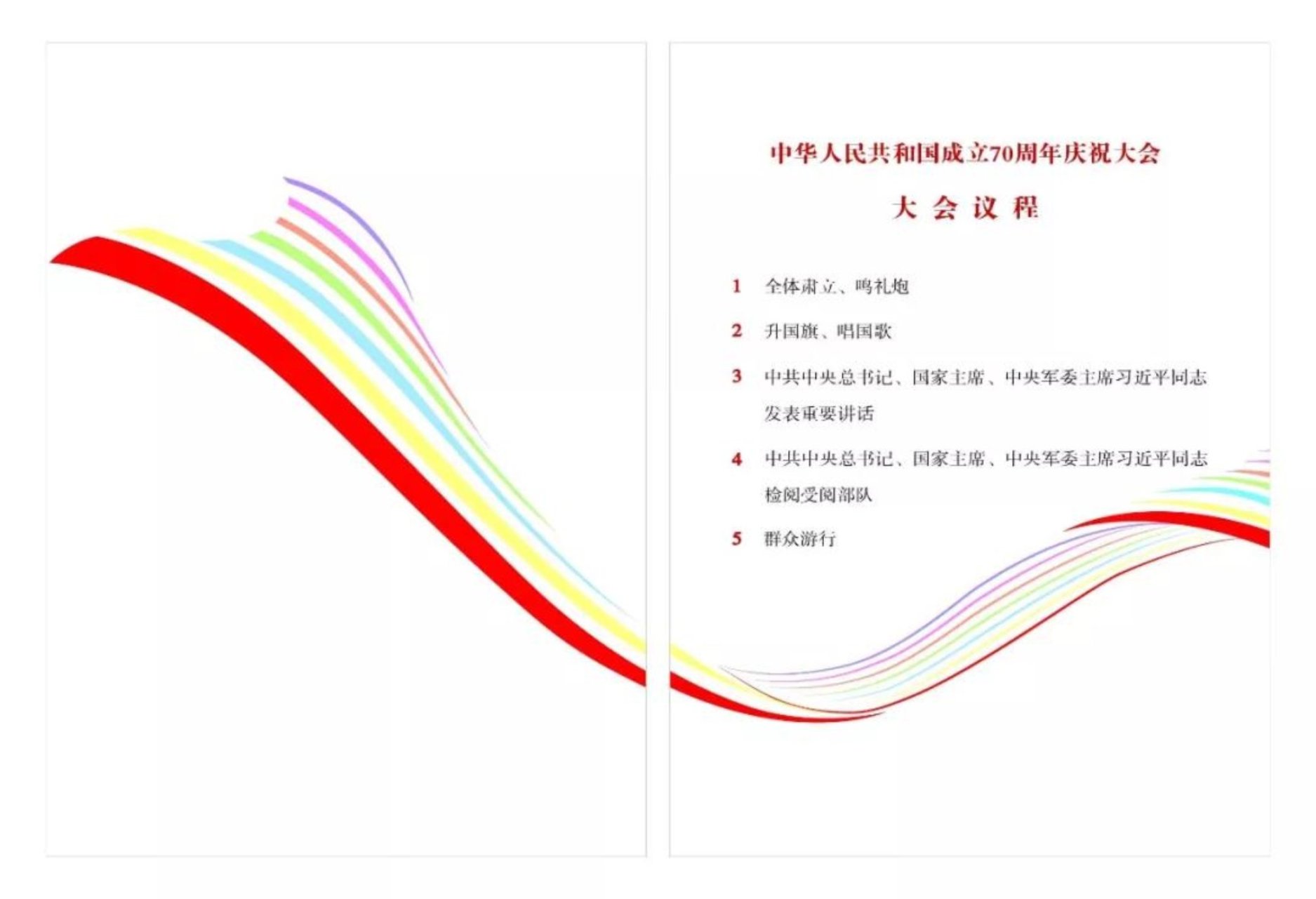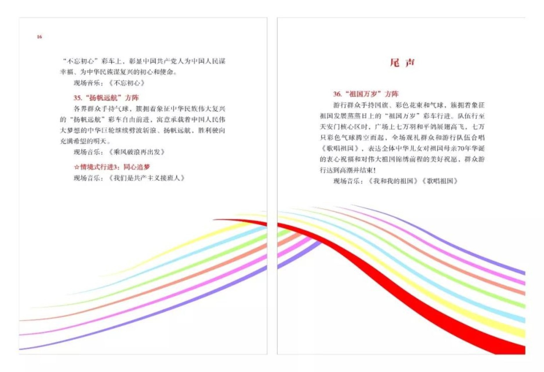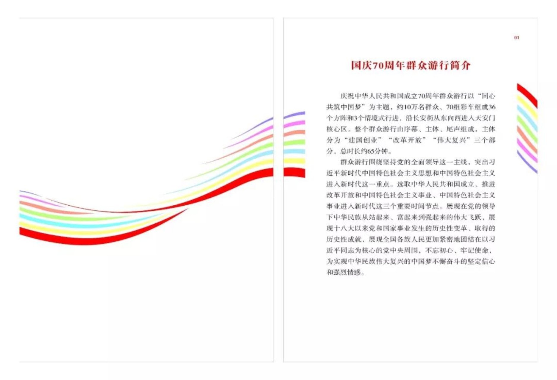 翻开封面映入眼帘的是金色的半透明雾面牛油纸上呈现出的国庆70周年标识的图形,与封面的烫金凸版印制的国徽和标题字相互呼应,手册内页贯穿着由封面红飘延伸为“七彩”的飘带,象征建国70年在中国共产党的领导下社会主义建设的伟大成就,特别是习近平新时代中国特色社会主义思想所开创的新局面。其中,红色彩条寓意建国70年传承的红色基因。设计借以中国画留白的艺术形式,通过虚实互化,追求空灵的视觉表达,体现中国民族化写意精神和现代化时代特征,艺术化地呈现出国庆70周年群众游行活动宛如一幅流动的多彩画卷。