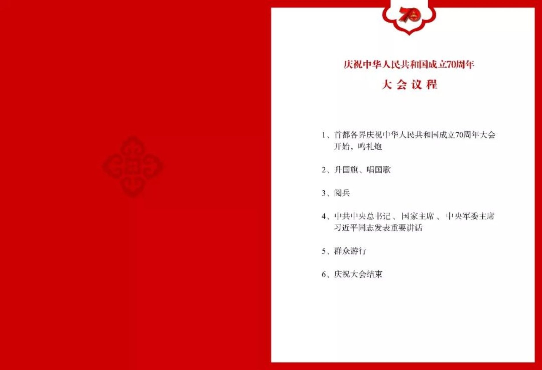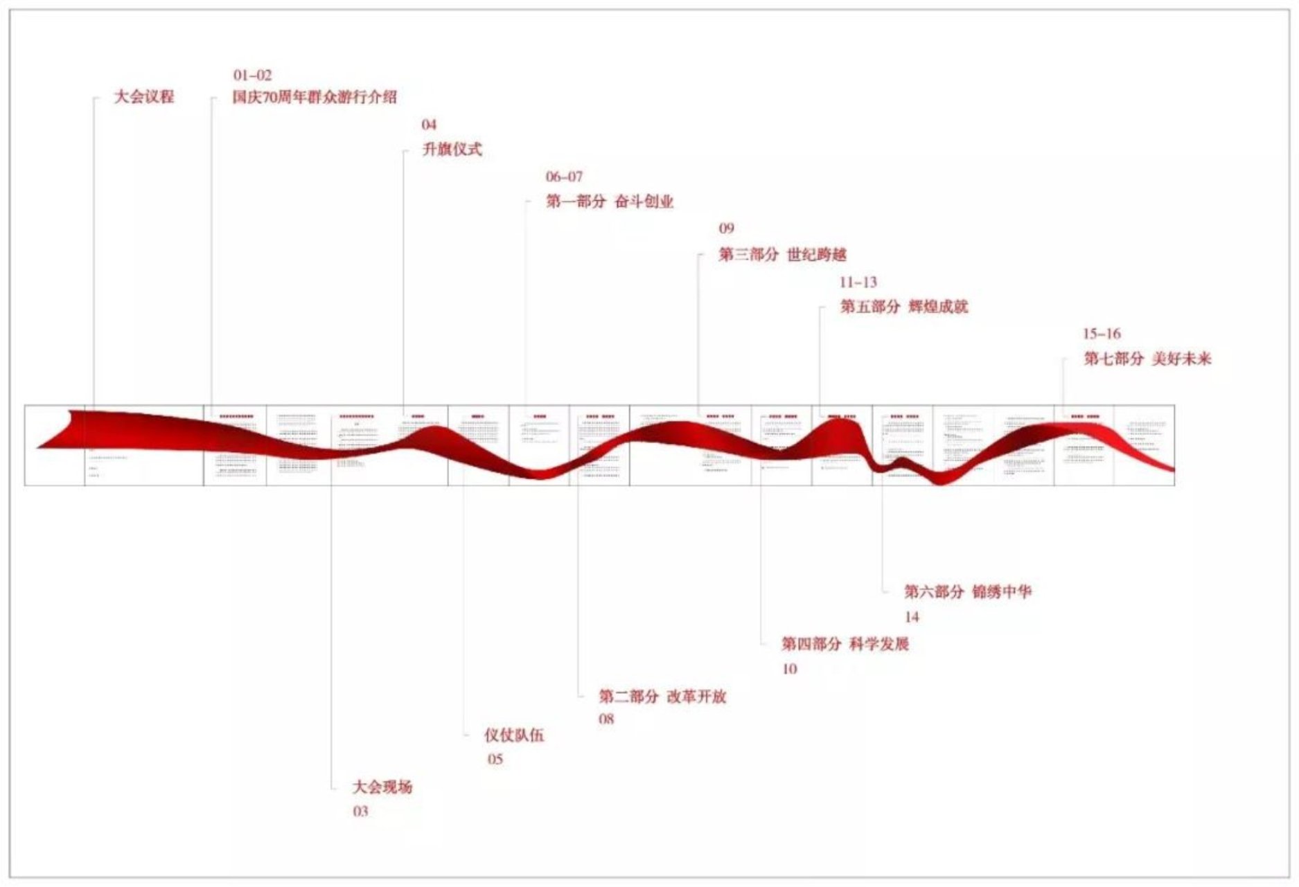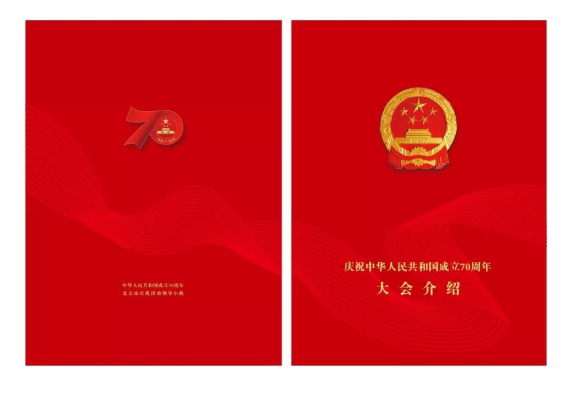手册封面与封底分别以代表国家形象的国徽和中华人民共和国成立70周年活动标识作为设计核心元素,以一条飞扬并极富律动感的红飘带贯穿,寄托中华民族伟大复兴的中国梦,与广场红飘带景观形成呼应,并以中国红为底色,烘托节日的欢庆气氛。体现国庆70周年典礼的庄重感、大国的民族气派和时代特征。同时合理的运用特殊印制工艺,彰显手册的精致感与印制艺术性。