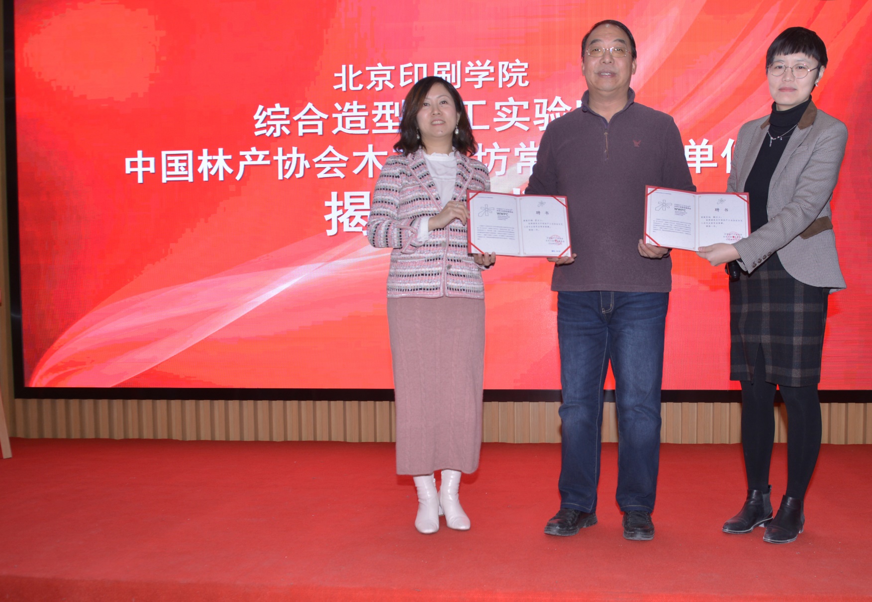 在讲座前,李双寿教授,林业出版社建筑分社社长、中国林产工业协会木艺工坊专业委员会执行长纪亮,图斯特工具系统技术上海有限公司全国大客户经理、林产工业协会木艺工坊专业委员会副会长贾刚等来宾与设计艺术学院领导共同为我校综合造型加工实验室进行了揭牌,该实验室正式成为中国林产工业协会木艺工坊常务理事单位。揭牌后李双寿教授为设计艺术学院院长张彬、工业设计专业主任杨莉、教师赵颖颁发了中国林产工业协会木艺工坊专家委员会专家、常务理事及理事聘书。