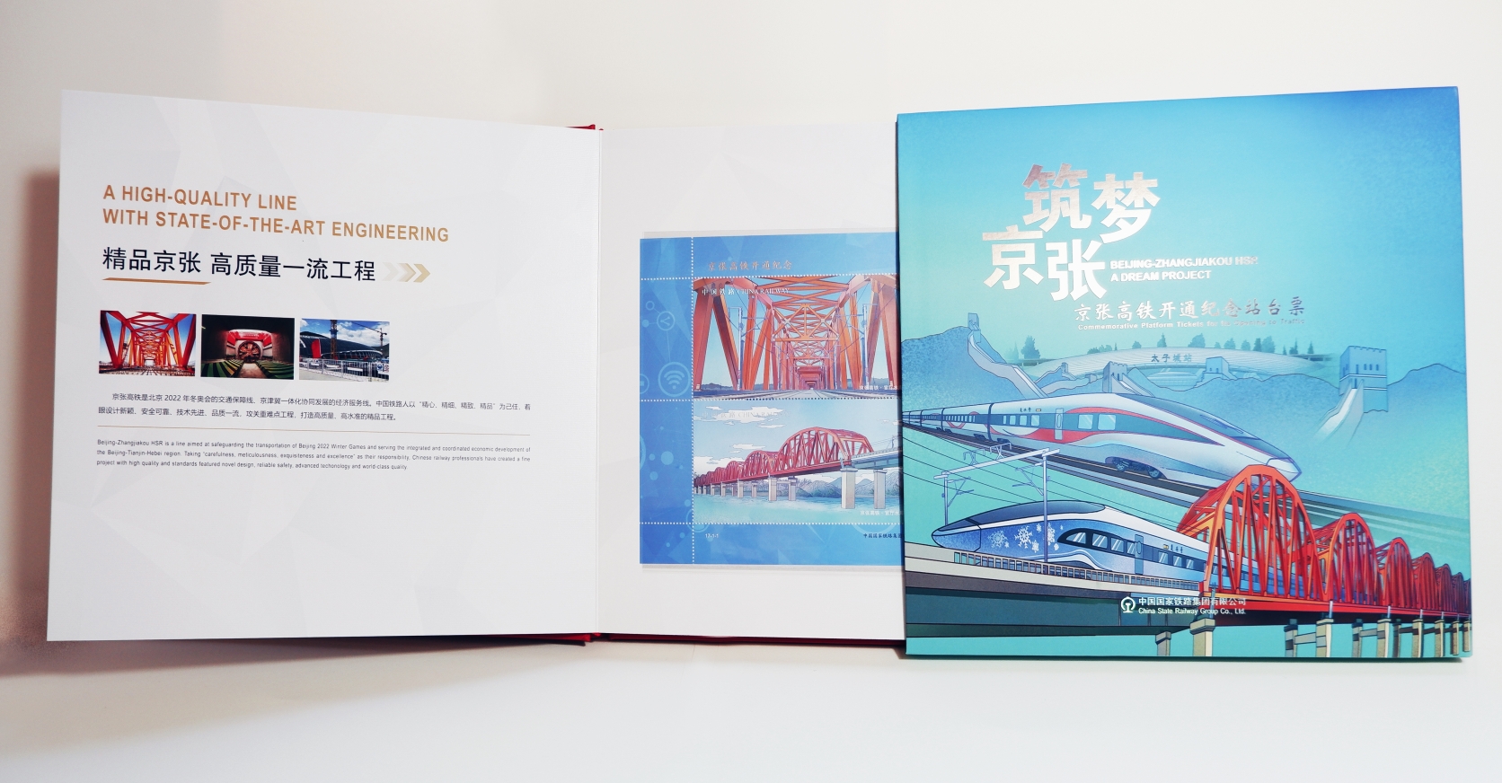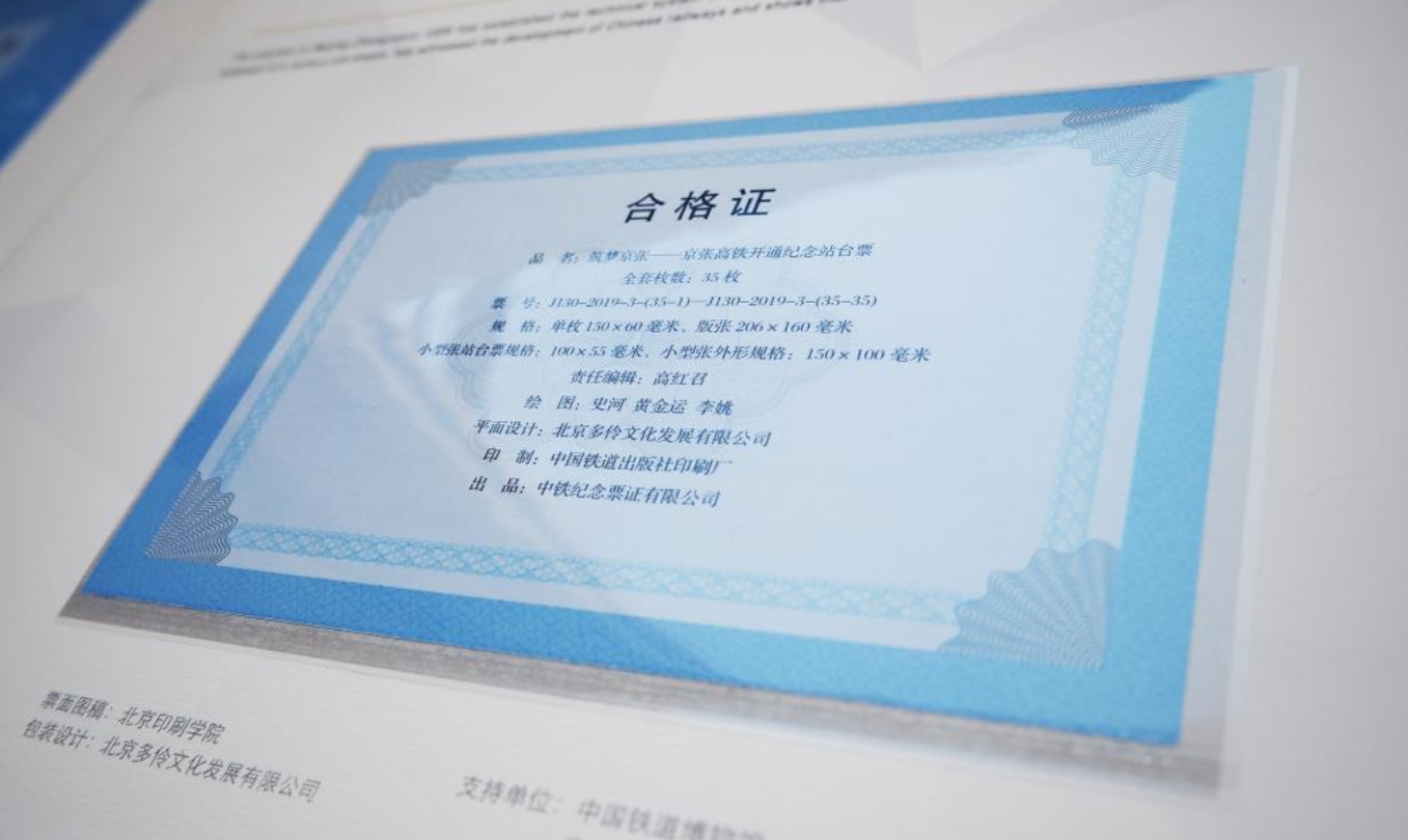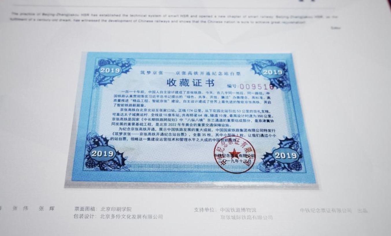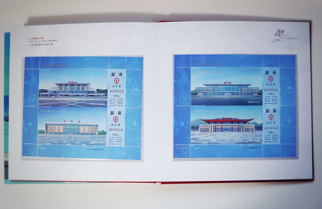 2019年12月30日,京张高铁正式开通,向世界展示了中国铁路发展新成就。中国国家铁路集团特发行《筑梦京张——京张高铁开通纪念站台票》以资纪念。全套共35枚纪念票,其中小型张一枚。票面以独特的插画艺术风格,表现了包括北京北站至张家口站全线的十座车站、部分重要桥梁、隧道、周边景观以及车站运行的自动化系统、智能系统、交互系统等内容正式面向社会发行。此套纪念票票面图稿由北京印刷学院设计艺术学院史河、黄金运、李姚创作绘制。