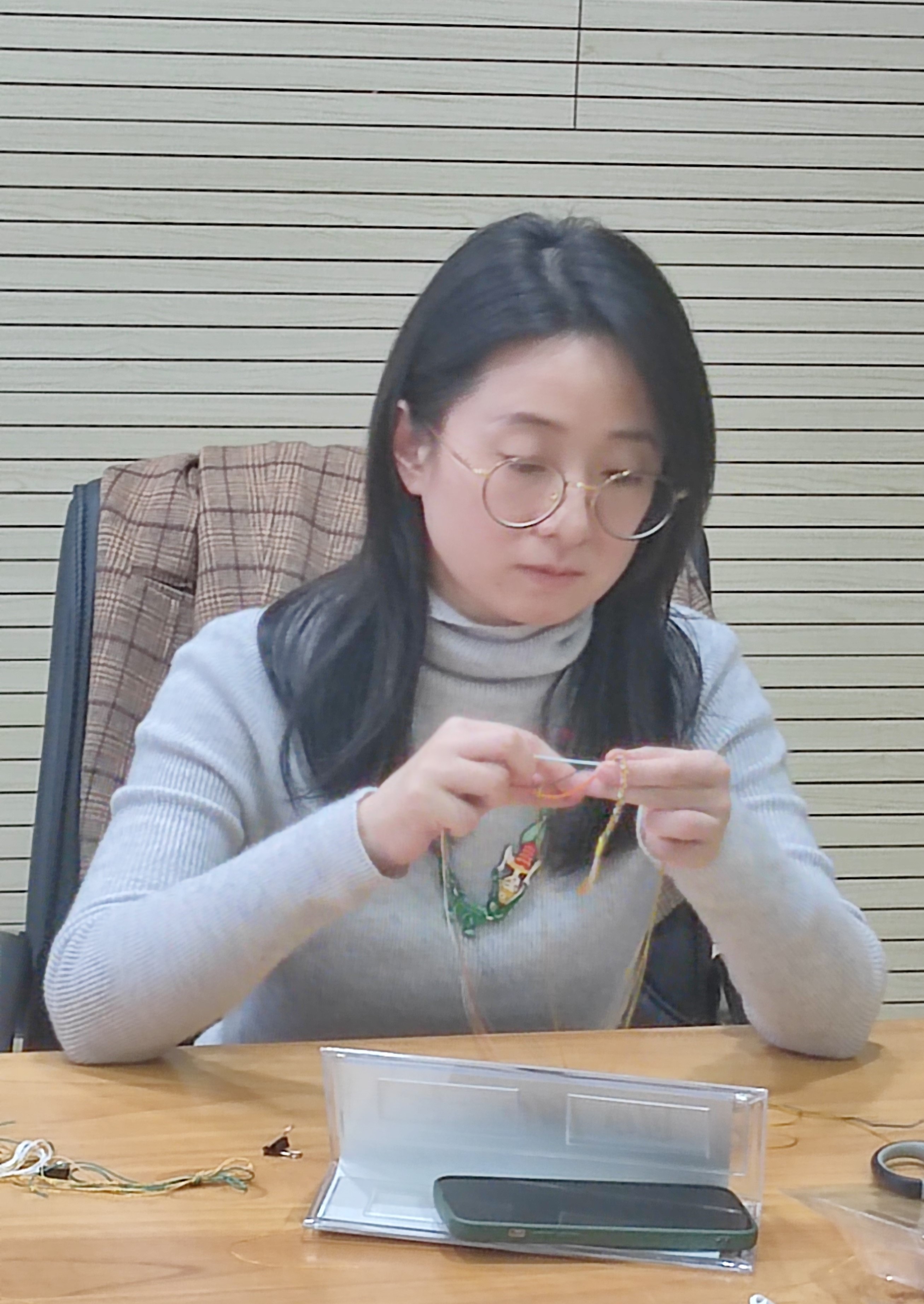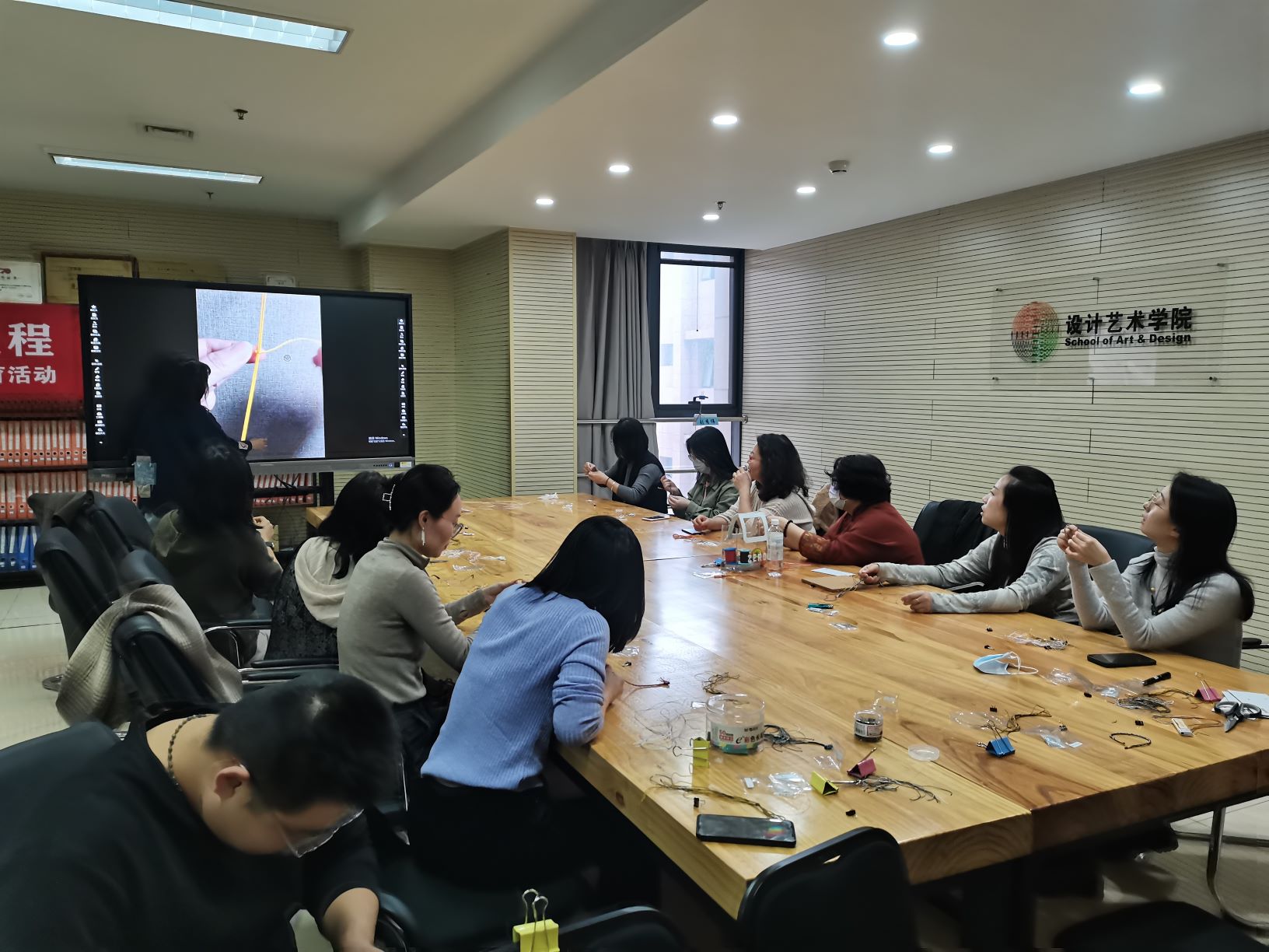 中国绳结艺术是古老的传统艺术,历史悠久,最早可追溯到结绳记事。绳结编织图案寓意吉祥,色彩绚丽多姿,是中华民族传统文化中的典型符号。在当代,以绳结为灵感来源创作的艺术作品,经常出现在国家重要的节日节庆活动中,成为了具有中国特色的视觉符号。学院张颖慧老师为大家讲解了绳结艺术的历史与编织方法,老师们认真学习实践,在手工艺中体会中国传统文化之美,身心得到了愉悦与放松。五彩线在指尖灵动的飞舞,编织美好的璀璨人生。