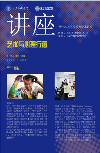 11月1日下午,由设计艺术学院主办,学校心理协会、设艺美术系协办的"艺术与心理疗愈"学术讲座在E楼一阶教室顺利举办。本次讲座邀请了中央美术学院青年教师田宇和心理疗愈专家孙彧。讲座由设艺牛明明老师担任主持,来自设计艺术学院绘画专业本科生、中国戏曲学院学生、丰台区小学美术教师等参加了此次讲座。