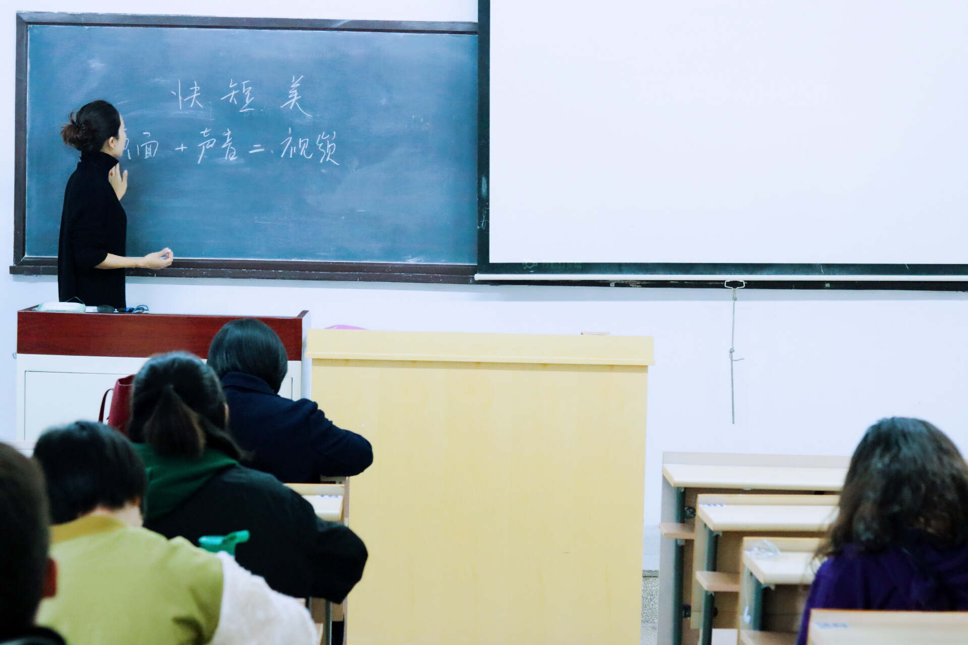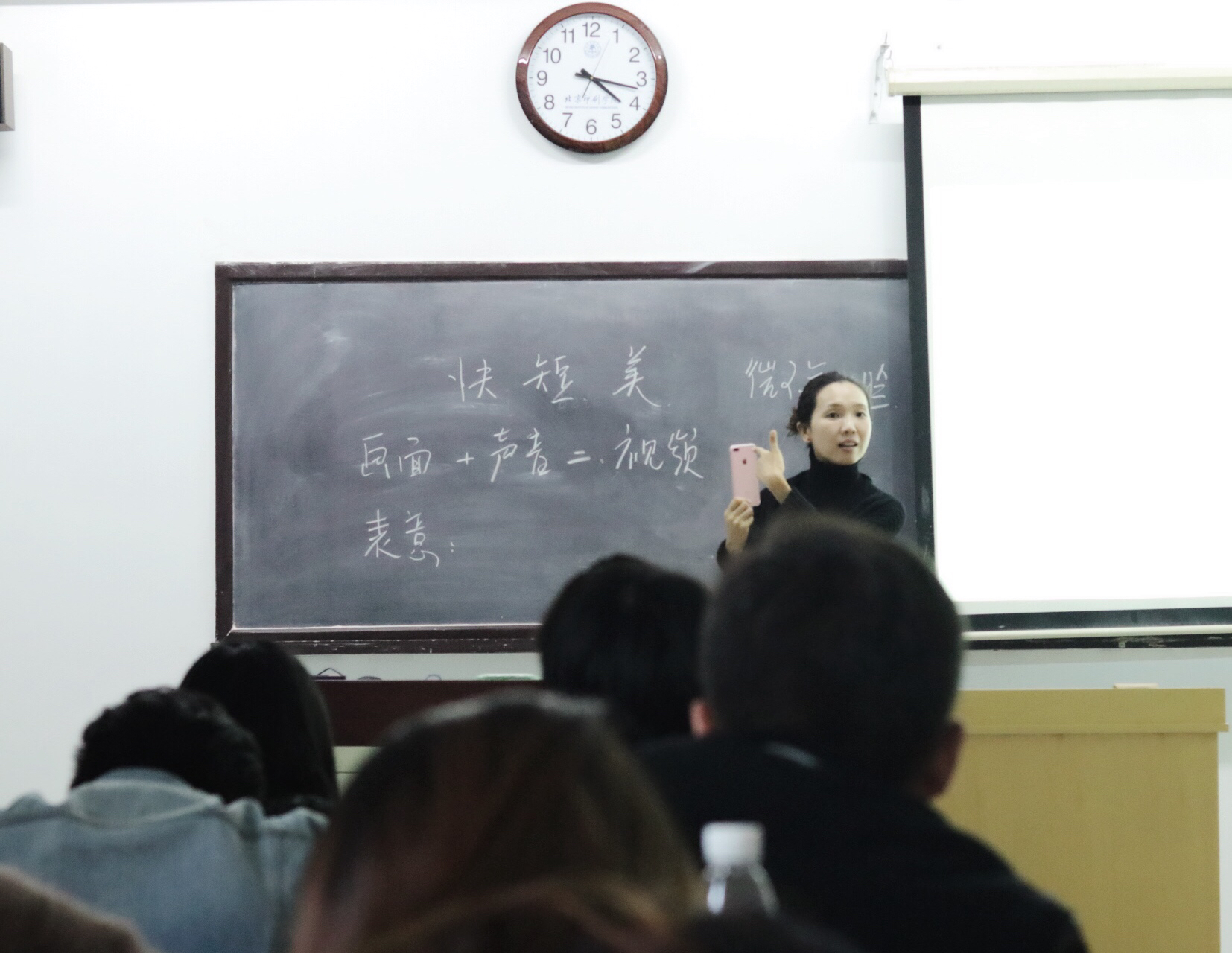 2017年11月1日下午,设计艺术学院邀请资深电视节目制作人,清华大学、北京印刷学院联合博士后工作站博士后张贞贞老师,在教C楼422教室,为2017级艺术设计专业硕士研究生做了“快短美——短视频的审美解析”的专题讲座。开讲前,张贞贞老师就同学们是否喜欢短视频,以及喜欢哪些类型做了简短的询问与了解。在讲座中,通过各类短视频实例,张老师从画面、声音、构图、逻辑关系等方面对短视频的制作与审美进行了专业性的精到解析。在讲座的问答环节,张老师就相关问题与同学们进行了互动交流。设计艺术学院龚小凡教授主持了本次讲座,2017级艺术设计专业硕士研究生40余人参加了讲座。