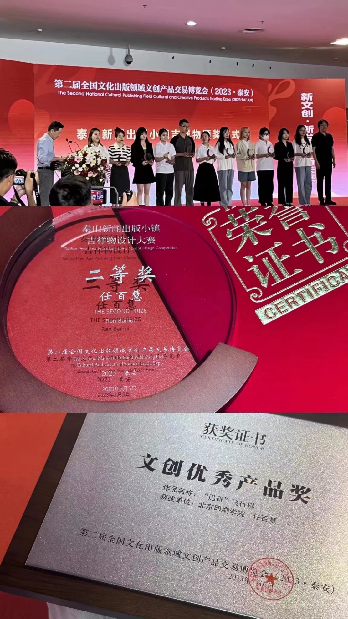 2023 年7 月3 日-7 日,由张晓东院长带队,设计艺术学院师生参加第二届全国文化出版领域文创产品博览会。本次博览会由中国出版协会、中国新华书店协会、中共山东省委宣传部指导,泰安市人民政府主办,北京印刷学院等单位特邀协办。学校党委常委、副院长刘益在大会论坛作主题演讲,师生携文创产品参展博览会,获得了多项奖项。