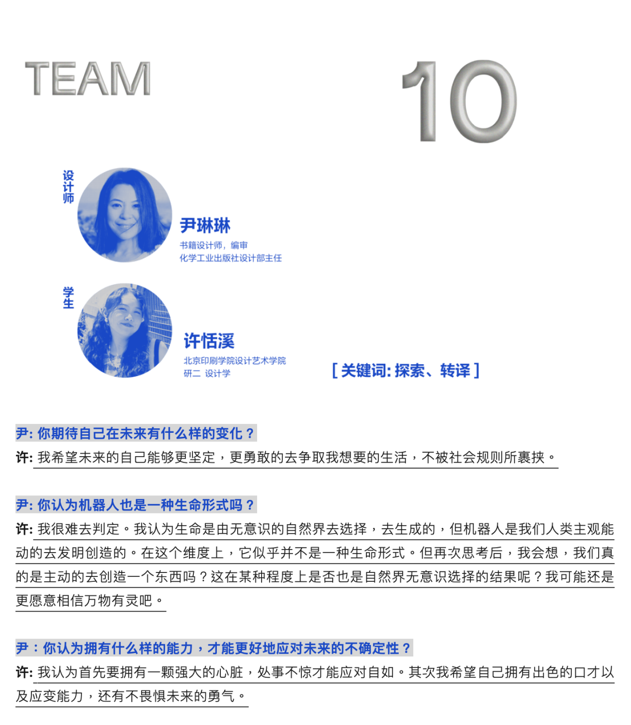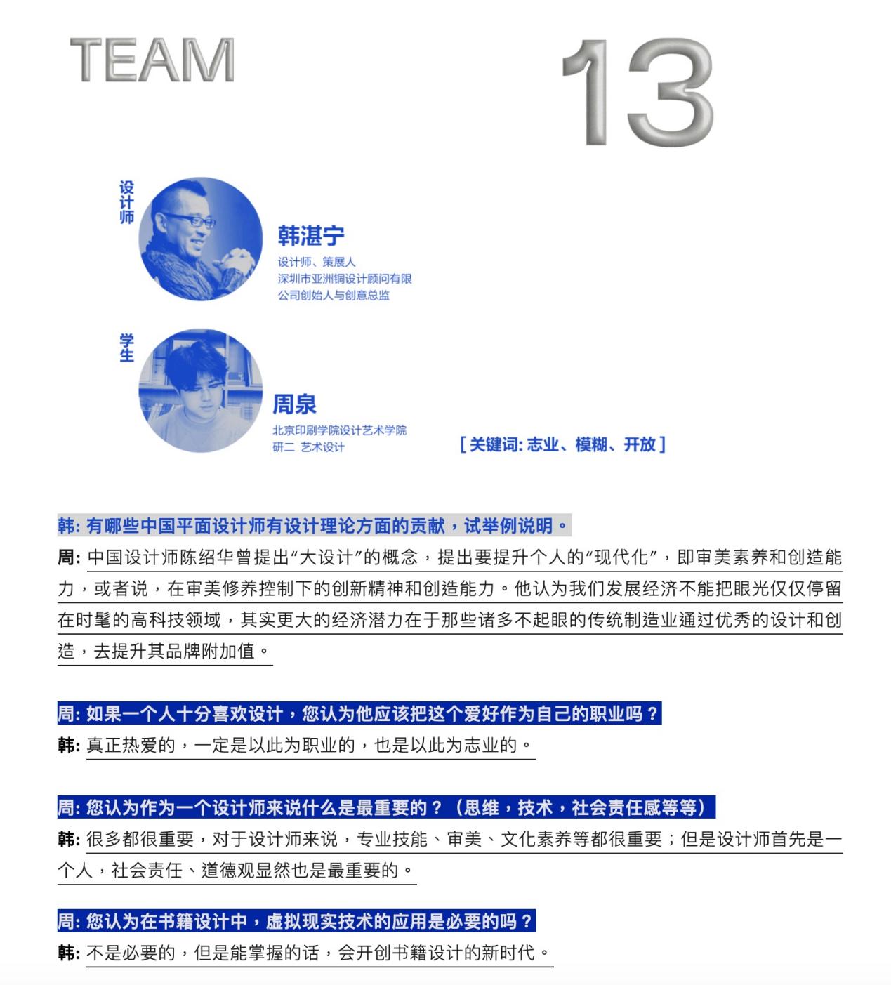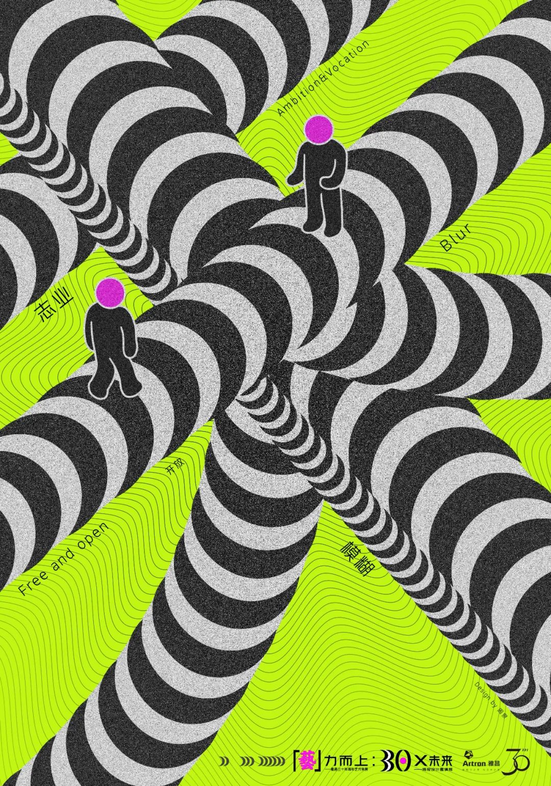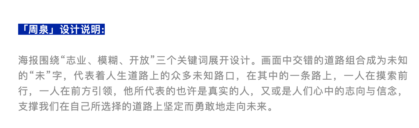 “「藝」力而上”设计篇以“30×未来”为题,邀请15位知名书籍设计师和来自12所高校的15位学生共同探讨这个命题。展览由15组“1位设计师+1位学生”创作作品组成,著名设计师、策展人韩湛宁、化学工业出版社设计部主任尹琳琳与周泉、许恬溪组成创作搭档,相互提出当下自我关注、迷惑、思考的问题和答案,并从中提取每一组的创作关键词,最终呈现出具有对话性的命题海报设计。关键词有“试错”“探索”“致敬”“浪潮”……这一场中坚力量和新锐青年的碰撞折射着多重维度下的个体认知和对社会、行业的诘问,为无限可能的“未来”带来诸多值得思考的声音。