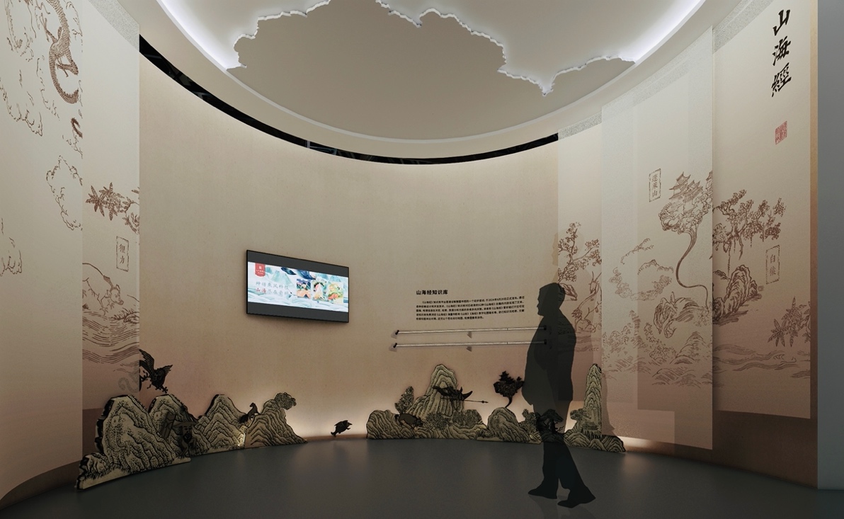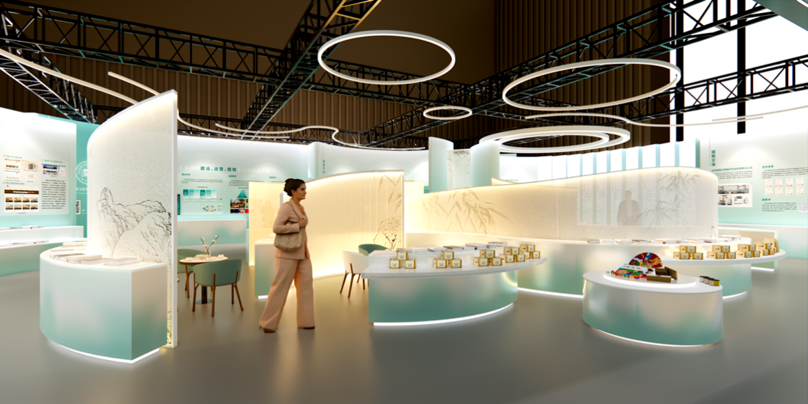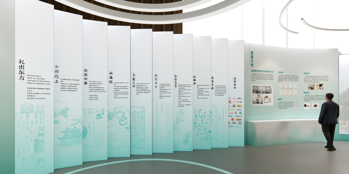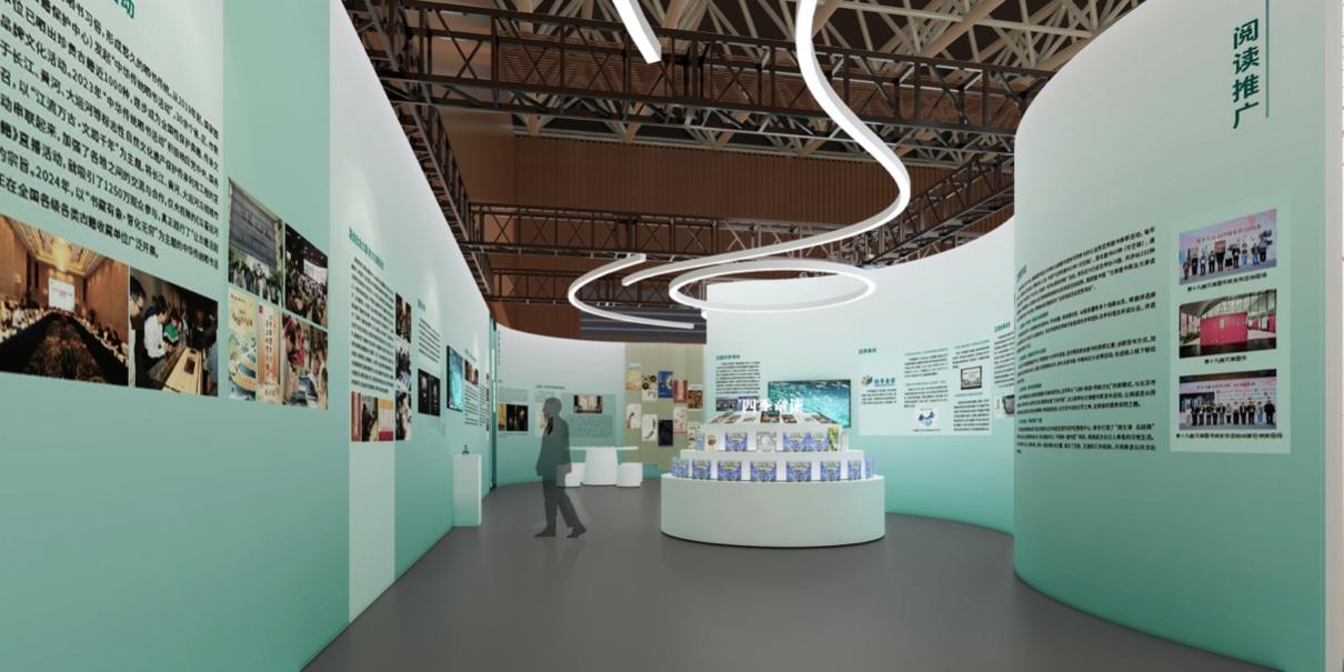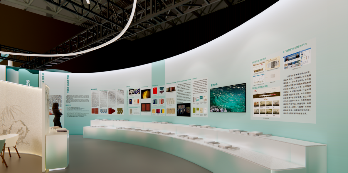本次中国国家图书馆展陈设计的主视觉色以青绿色为主,象征“雨过天青 向新而生”,紧扣年会主题。选取书籍、书卷、纸张等元素为空间造型语言,打破传统直线布局的单调性,赋予空间以流动感。在视觉语言设计上,提取古籍中的文字、色彩、纹饰等元素加以运用,通过灯光及展板设计,营造一种兼具古典韵味和现代简约之风的空间氛围,并注重设计与科技相结合,在展厅中设置有多处互动区域,利用虚拟现实、数字人互动屏等多媒体技术,为参观者带来多感官体验,提升展览的趣味性和互动性,进一步强化了展陈空间的文化底蕴和艺术氛围。