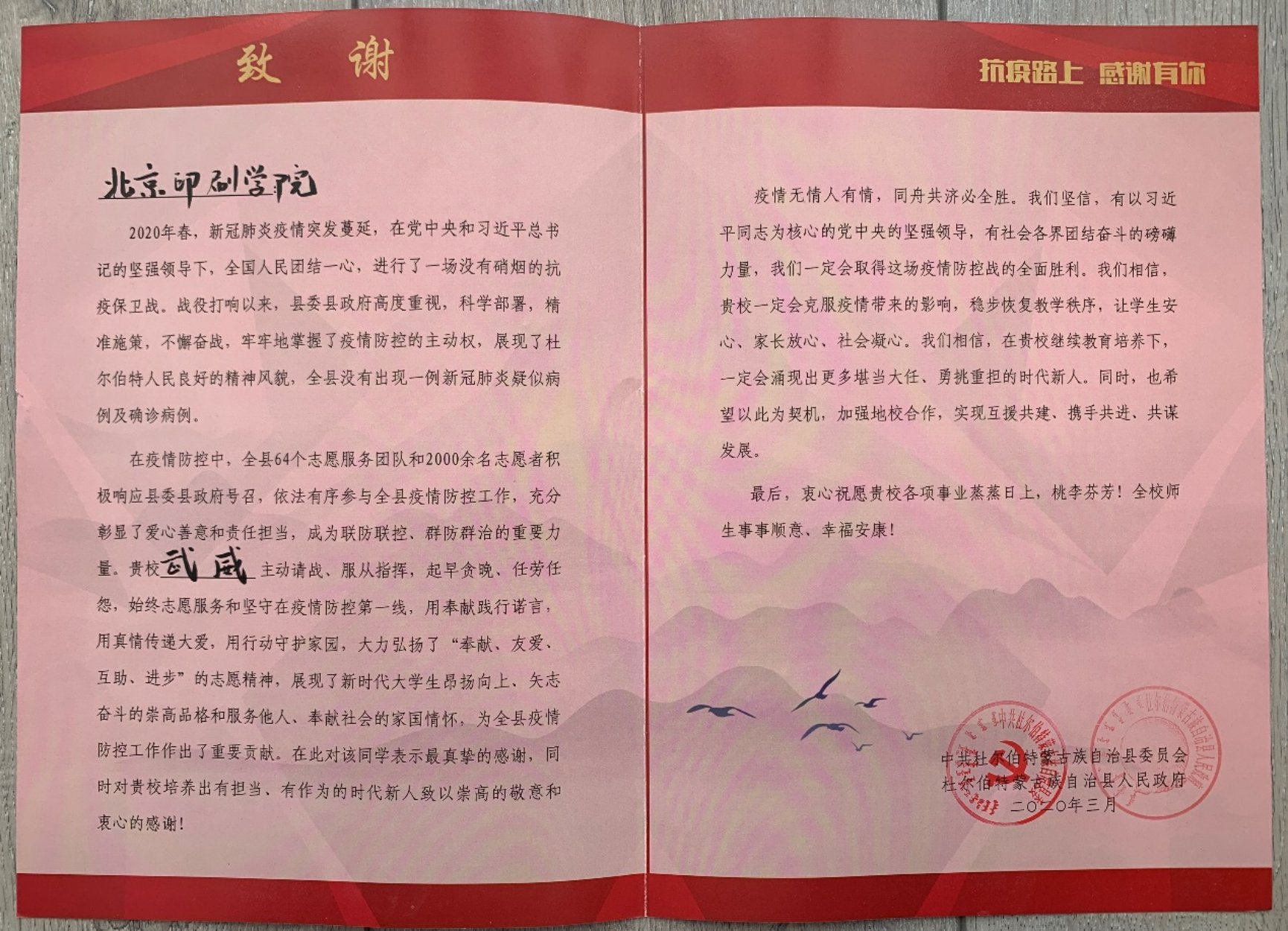 新冠状病毒疫情暴发后,16级展示2班学生武威,积极投入到黑龙江省大庆市杜尔伯特蒙古族自治县东郡悦府社区的疫情防控志愿服务中,在30天总时长300小时左右的服务中,他认真登记出入居民信息,经常向居民宣传解释防控政策,对居民进行心理疏导。他还经常帮小区居民买菜购物、收发物品、消毒消杀,参与慰问支援湖北医疗队家属,受到小区居民的一致好评。在3.5学雷锋纪念日,被当地电视台作为学雷锋模范专题报道。获得最美志愿者称号。