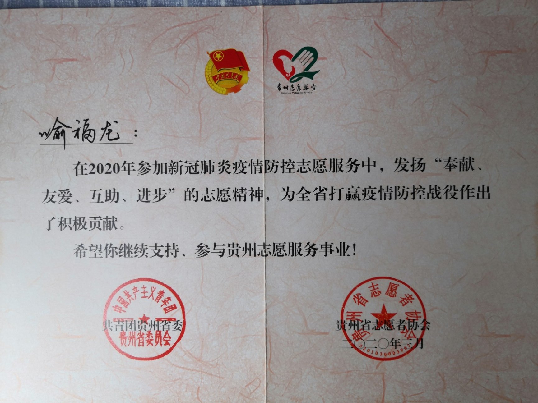 17级书籍1班的马心怡同学,在河北省邯郸市涉县天庄小区积极参与到疫情防控工作中,同社区管理人员对所在辖区挨家挨户进行摸排工作,掌握精准数据,宣传新冠肺炎自我防护知识、测量体温,累计志愿时长达200多个小时。