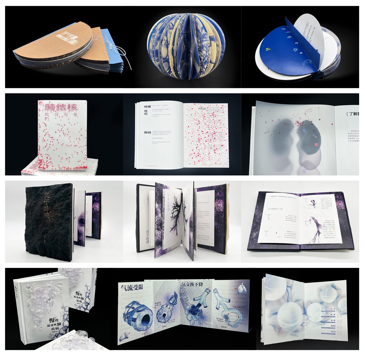 学校以出版为学科专业特色,在设计学、美术学基础上凝练出具有交叉融合特色的出版美学研究方向,助力出版强国建设和新时代出版行业高质量发展。出版物设计与研究是出版美学的重要研究方向。医学是出版物设计研究的重要服务面向之一。在4月份举办的“生命之书”工作坊中,学校研究生拿到了关于肺病的4个选题:哮喘、肺结核、肺癌、慢性阻塞性肺疾病。在与湘南学院医学学生深入交流和对各自选题深入了解基础上,同学们经过半年多的潜心创作,多易其稿,不断优化提升。刘萌萌的《哮喘·呼吸之间》、曹静宜的《肺结核的问与答》、许恬溪的《关于肺癌》、何欣阳的《慢性阻塞性肺疾病》,均从对应肺病的特征出发,提炼书籍设计理念,巧妙地运用书籍形态、装订方式、装帧材质、页面结构的创意,体现对应肺部疾病的内容特点,并在插图和版式方面进行了精心设计,呈现出了较高的书籍设计品质。作品的设计探索体现了出版物设计与研究方向以书籍设计注重人文关怀、助力医学出版物设计发展、探索中华出版美学形式语言的人才培养成效。