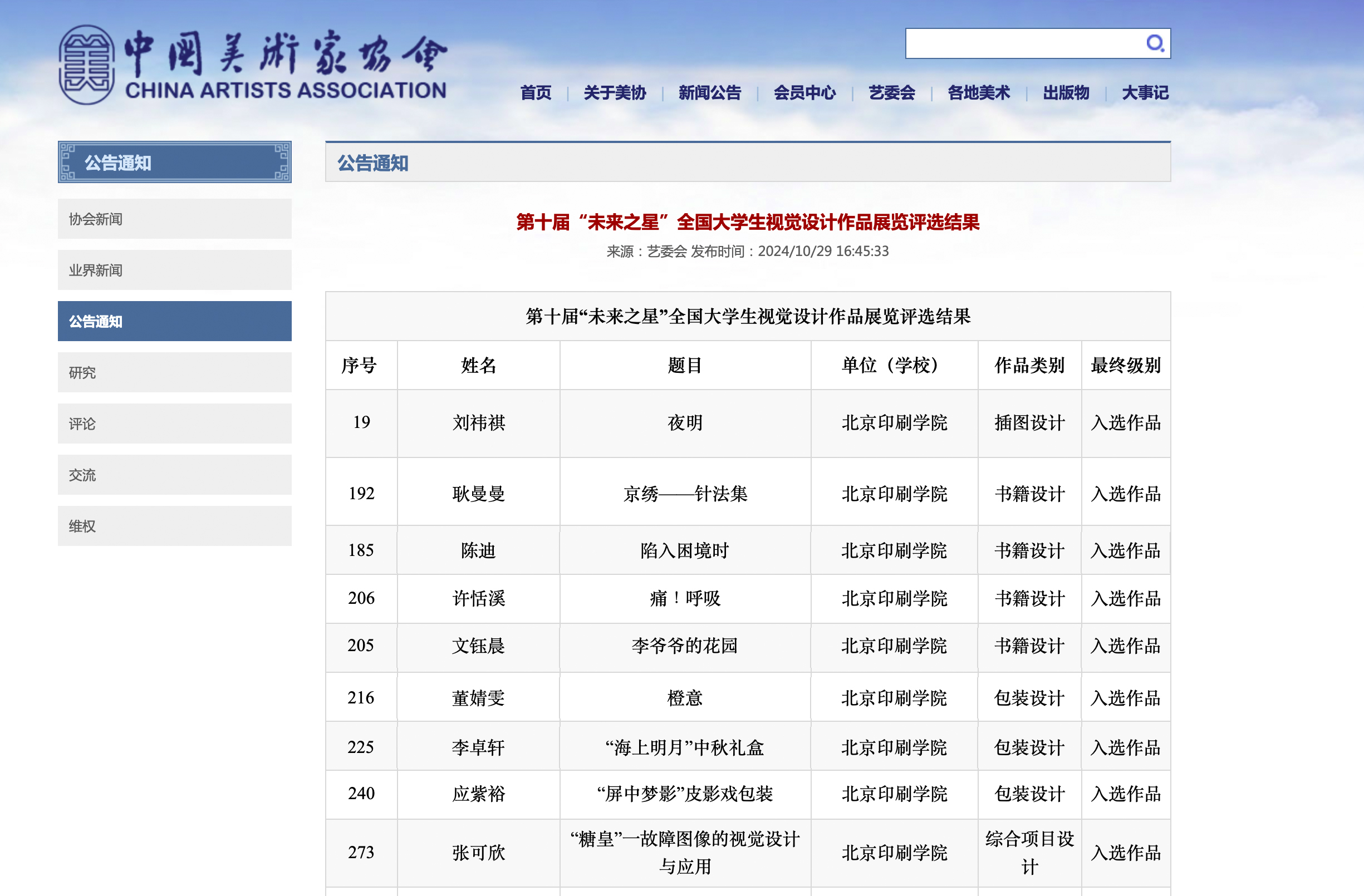 11月2日第十届“未来之星”全国大学生视觉设计作品展览在厦门市文联艺术展厅开幕,同期还举办了第十届全国视觉传达设计教育学术会议。10月29日,此次展览评选结果在中国美术家协会官网正式发布。比赛仅设置入选奖项,全国共计评选出273件作品,学校设计艺术学院教师杨大禹、夏小奇、刘馨元、蒋佳鸿、谢一菡、傅刚、何喜忠指导学生刘祎祺、耿曼曼、许恬溪、文钰晨、陈迪、董婧雯、李卓轩、应紫裕、张可欣创作的9件作品入选,包括插图设计、书籍设计、包装设计、综合项目设计四个作品类别。
