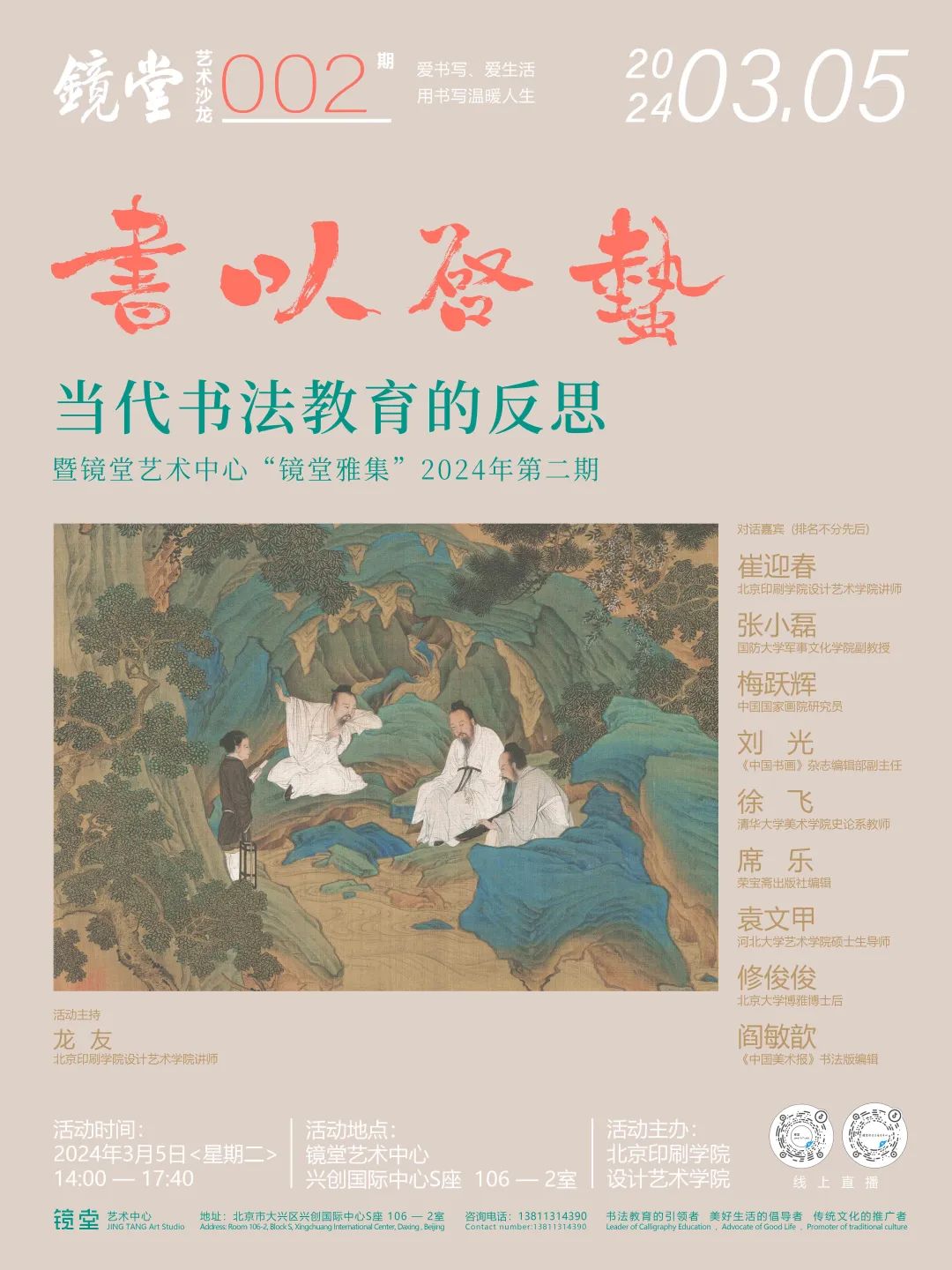 3月5日下午,由设计艺术学院主办、设计艺术学院理论部及镜堂艺术中心共同承办的“书以启蛰:当代书法教育的反思”青年学术研讨会在镜堂艺术中心举行。本次研讨会旨在加强美术与书法学科建设,推动学术交流,深入探讨当前书法教育的现状、问题及其未来发展趋势。