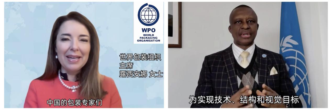 世界包装组织主席露西安娜、联合国工业发展组织驻华代表史蒂芬·卡格博视频致辞