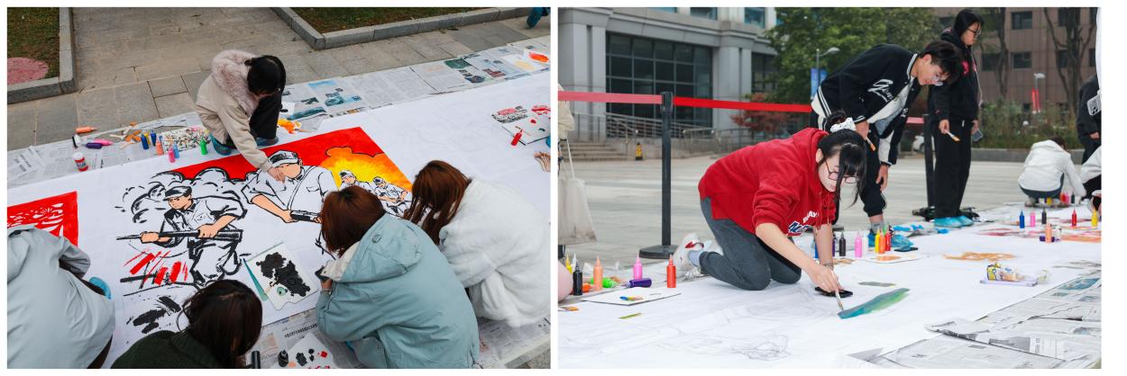 本次大赛围绕抗战历史及抗战精神、纪念中国人民抗日战争暨世界反法西斯战争胜利80周年大会、北印校园文化等主题创作。大赛以学生组织、新生宿舍为单位绘制手稿,经专业教师三次审稿,不断打磨修改,最终在校园进行集体创作。