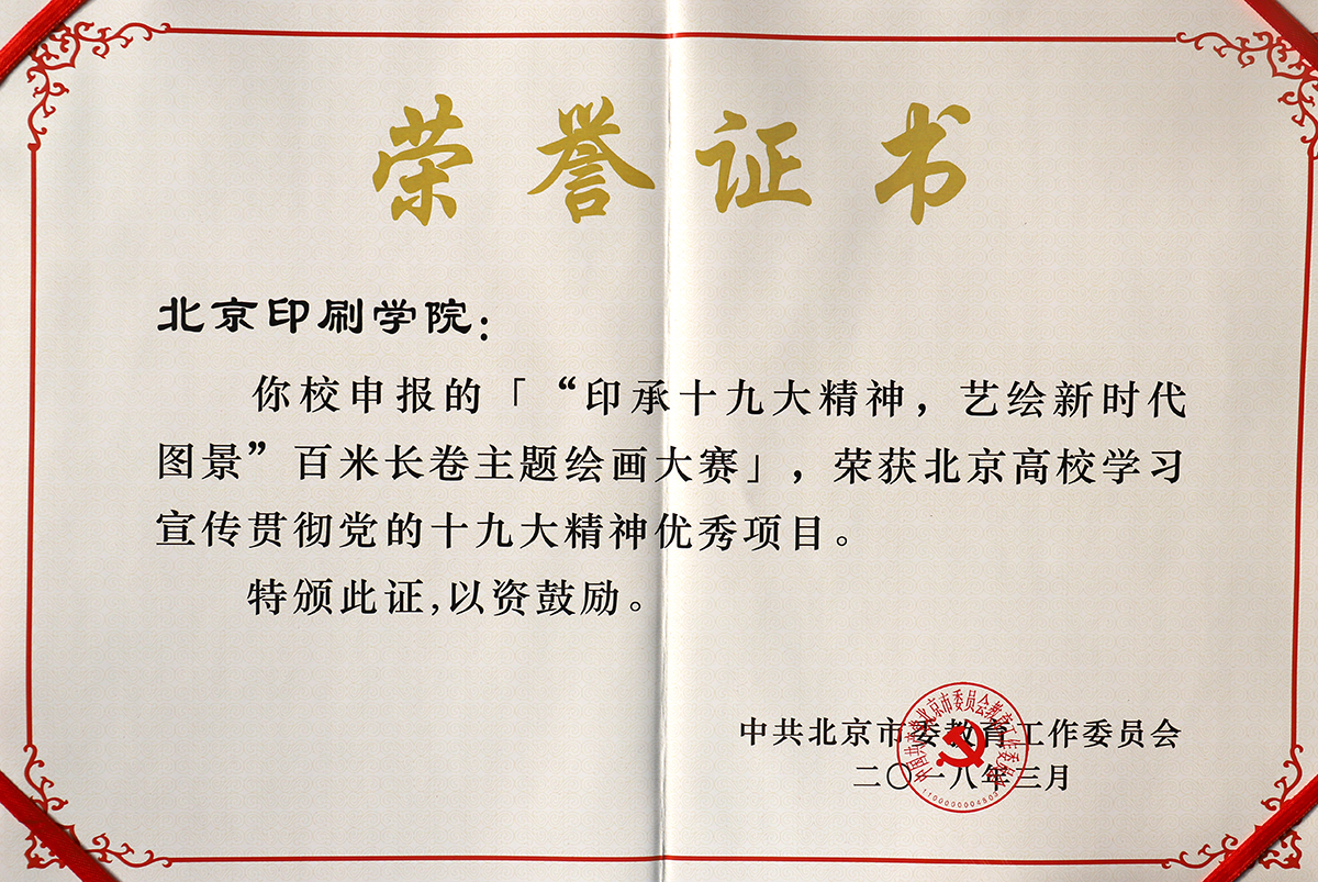 "‘印承十九大精神,艺绘新时代图景’百米长卷主题绘画大赛",荣获北京高校学习宣传贯彻党的十九大精神优秀项目。
