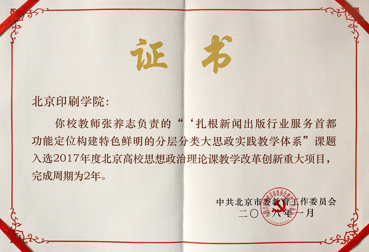 由北京印刷学院张养志负责的"扎根新闻出版行业服务首都功能定位构建特色鲜明的分层分类大思政实践教学体系"课题入选2017年度北京高校思想政治理论课教学改革创新重大项目。