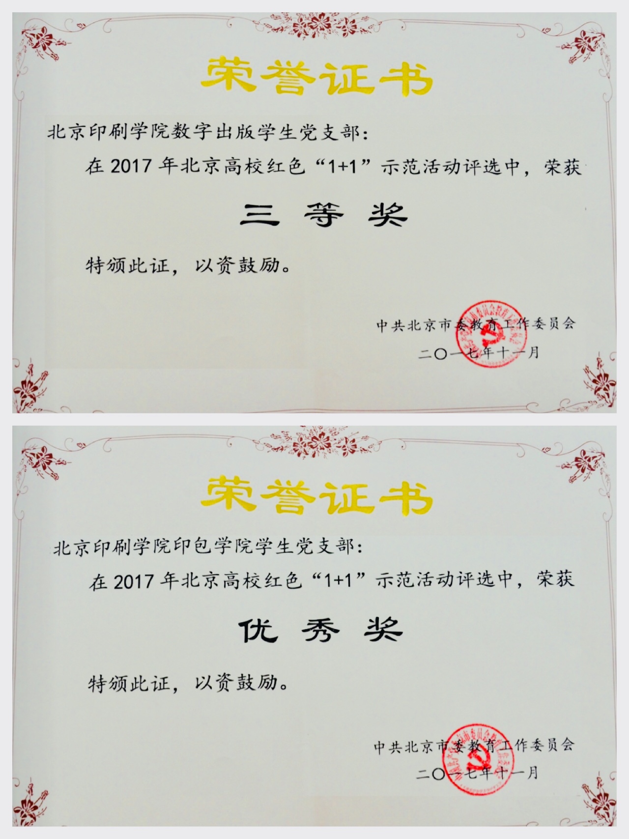 新闻出版学院数字出版学生党支部、印刷与包装学院学生党支部分别获得2017年北京高校红色"1+1"示范活动三等奖、优秀奖。