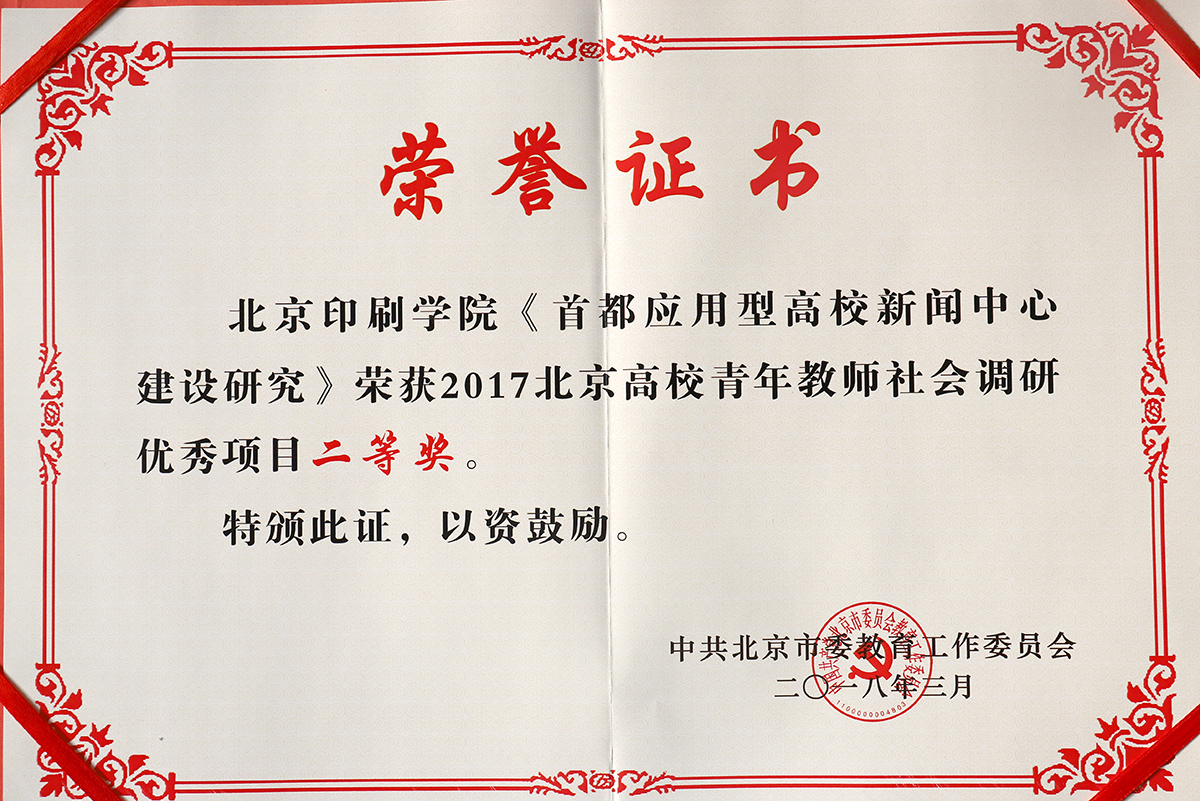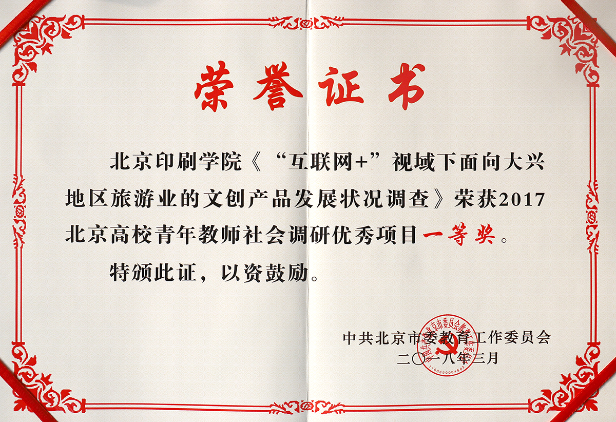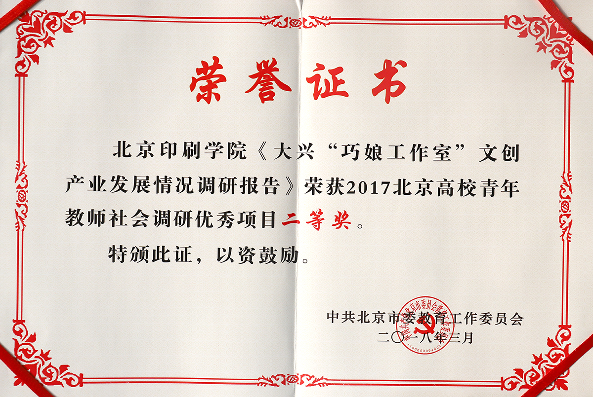 刘玲的《"互联网+"视域下面向大兴地区旅游业的文创产品发展状况调查》荣获2017北京高校青年教师社会调研优秀项目一等奖,袁园的《大兴"巧娘工作室"文创产业发展情况调研报告》、曹文露的《首都应用型高校新闻中心建设研究》荣获2017北京高校青年教师社会调研优秀项目二等奖。