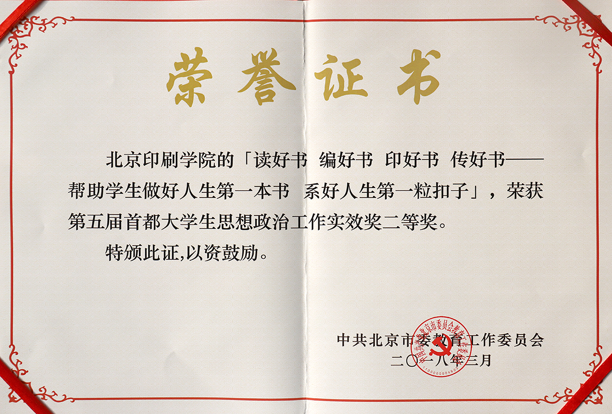 "读好书 编好书 印好书 传好书——帮助学生做好人生第一本书 系好人生第一粒扣子",荣获第五届首都大学生思想政治工作实效奖二等奖。