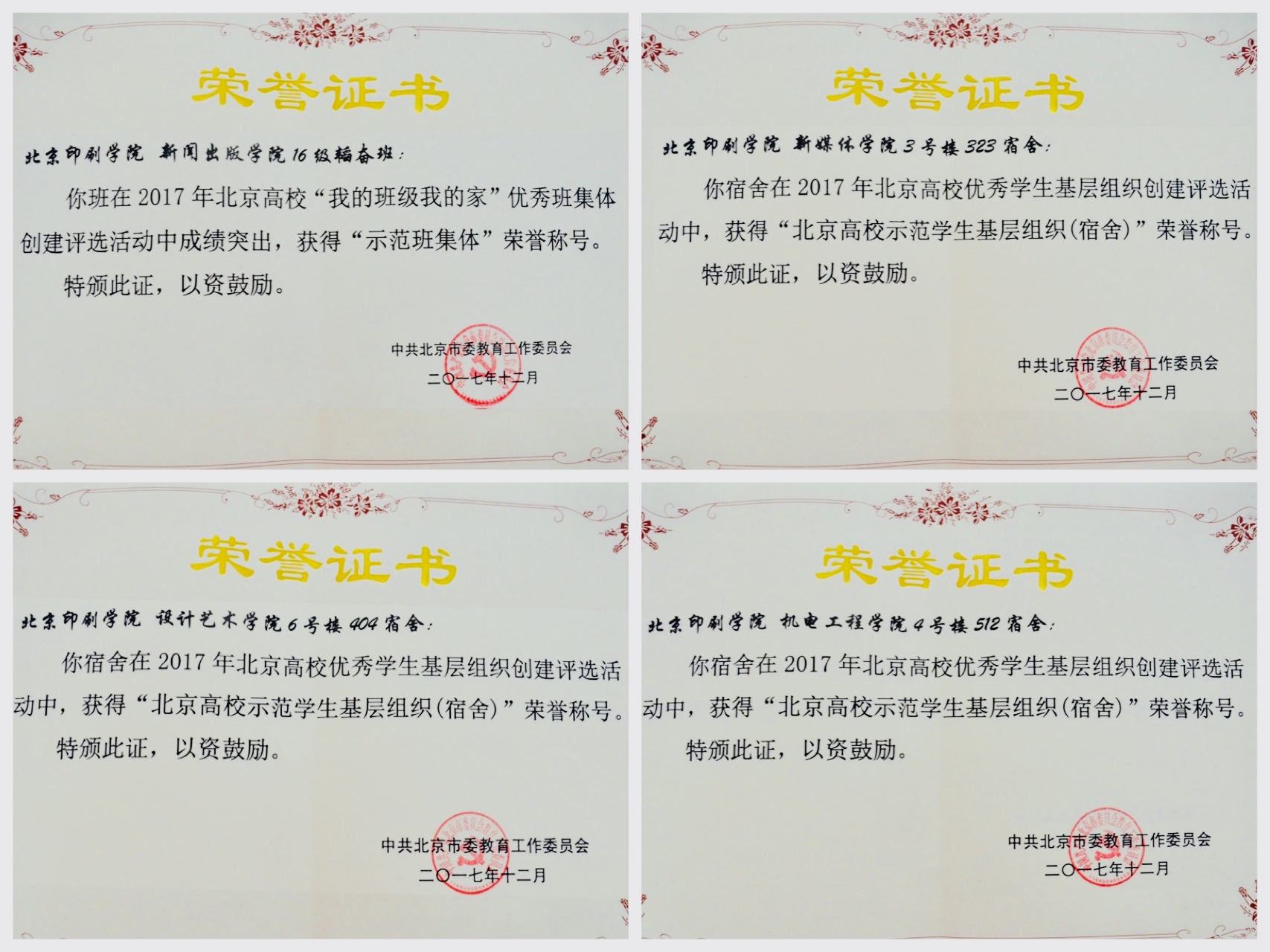 新闻出版学院16级韬奋班获得"示范班集体"荣誉称号。机电工程学院4号楼512宿舍、新媒体学院3号楼323宿舍、设计艺术学院6号楼404宿舍荣获"北京高校示范学生基层组织(宿舍)"称号。