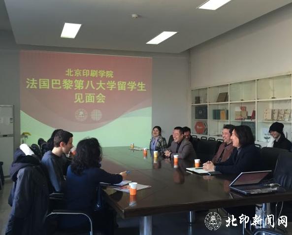 3月7日上午,法国留学生见面会在设计艺术学院会议室举行。此次来北印学习的四位法国学生,受到法国国家教育、高等教育暨研究部(法文:ministère de l'éducation nationale, de l'enseignement supérieur et de la recherche, Menesr)的“精英教学计划”支持,涵盖了视觉传达设计、数字媒体艺术专业,该计划将持续到2020年。北京印刷学院校长助理张养志、巴黎第八大学中法交流合作项目负责人杨阳、国际教育学院院长李晓全、设计艺术学院和部分职能部门的师生出席了见面会。见面会由设计艺术学院副院长张晓东主持。