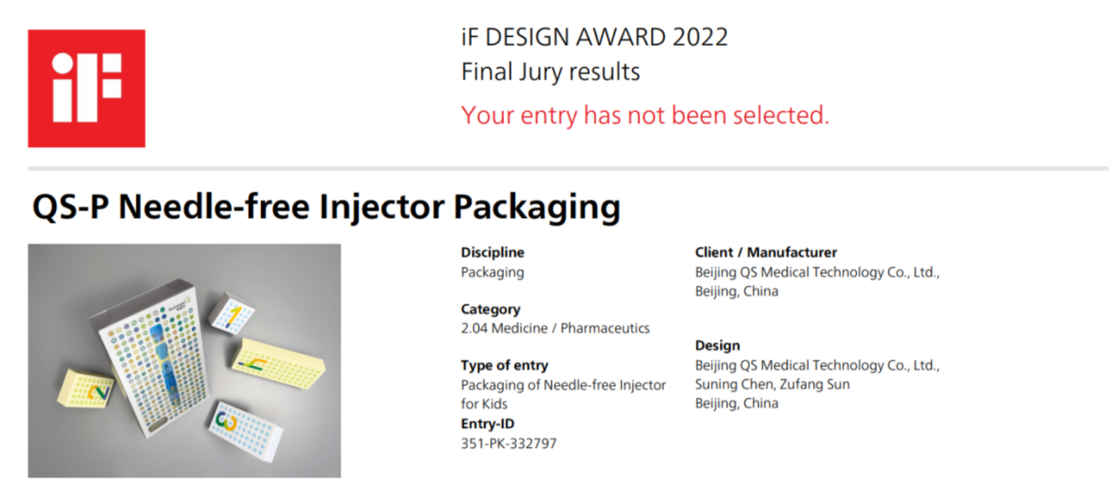 儿童无针注射器包装获得iF奖入围